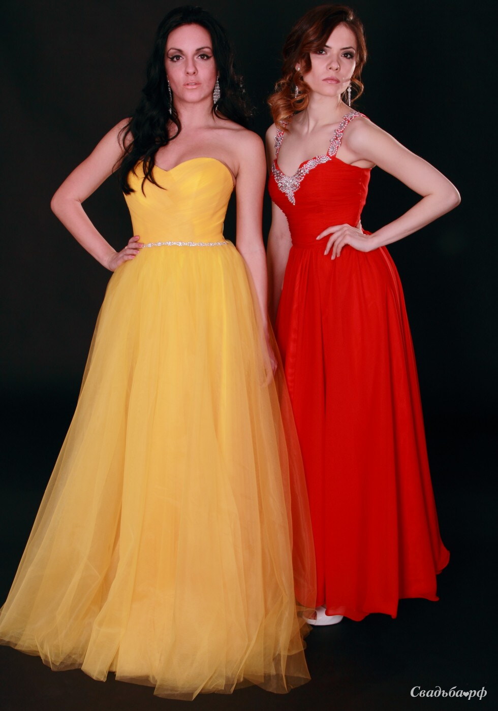Бренд: Elena Solodkova. Похожесть платьев состоит в длине, все остальное разнится. Начиная с тканей: мягкий жёлтый фатин создает воздушность, не давая чёткого контура силуэту;