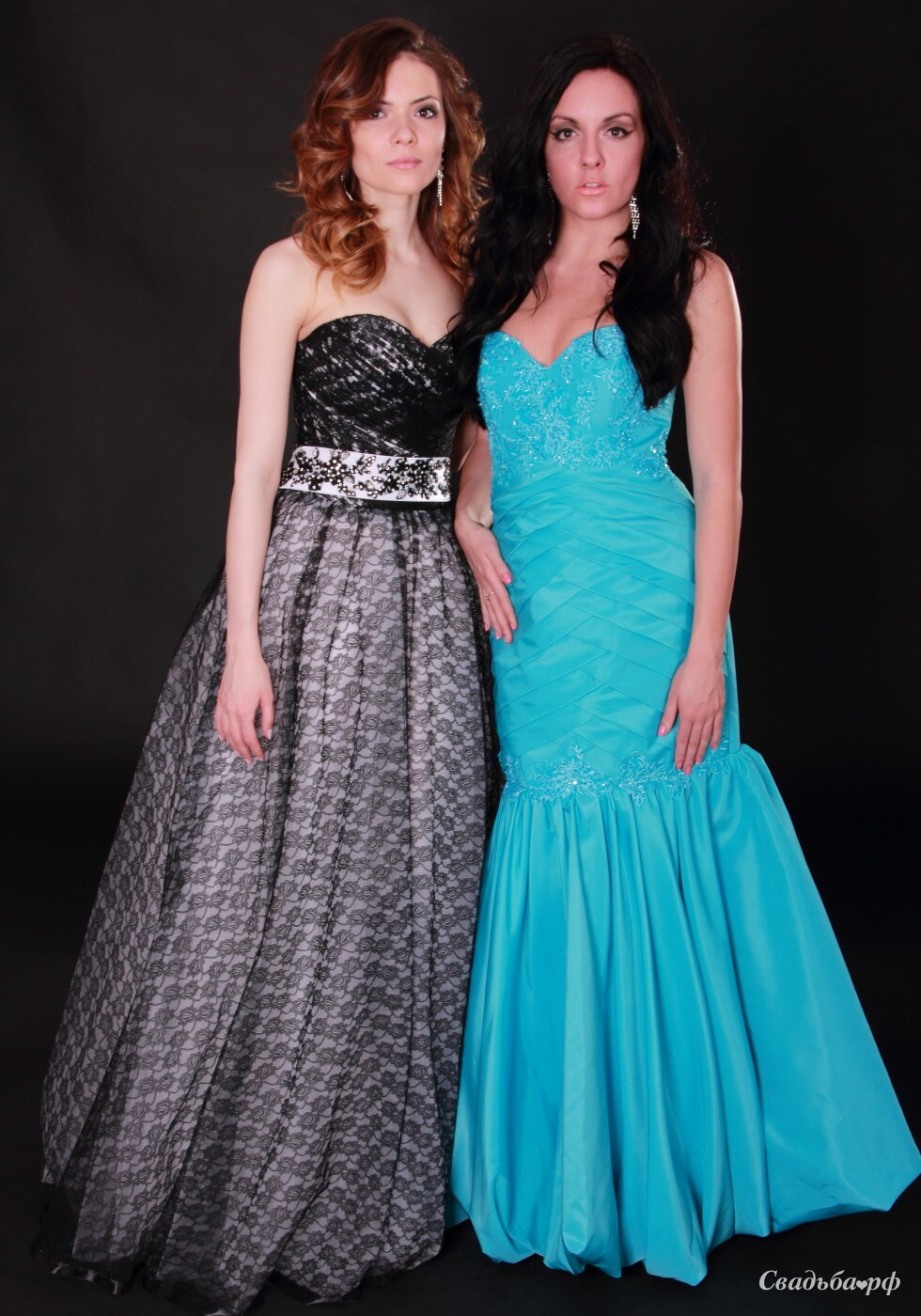 Бренд: Elena Solodkova. Два длинных платьев, разных по фасону:А-силуэтное и "Русалочка". Единственной схожестью является V-образный вырез на грациозном декольте. Первое платье выполнено из тончайшего чёрного гипюра, оформленного по подолу юбки атласным кантом, а в области талии - широким, молочного цвета поясом с элементом бисерной аппликации. Второе платье выполнено из плотной органзы, удлинённый корсет украшен крупными закладками с элементами кружева, а нижняя юбка "баллоном" завершает неповторимость превосходного образа.