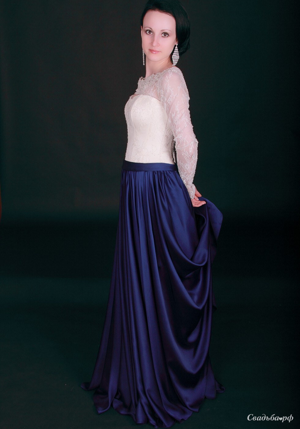 Платье А-силуэта. Корсет из кружева оформлен длинными рукавами и дорогой вышивкой из бусин в области шеи. Роскошью данной модели является контрастная тёмно-синяя юбка из натурального шелка.