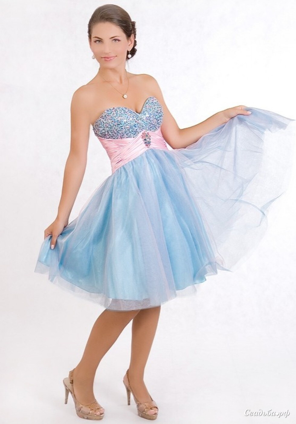 Бренд: Aspeed. Пышное короткое платье из двухцветного голубого и розового фатина, с плотной вышивкой из страз на лифе.
