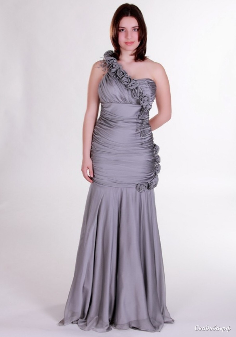 Платье силуэта рыбка, выполненное из шелка, потрясающего серебристого цвета, переливающегося в более светлые тона -"хамелеон".