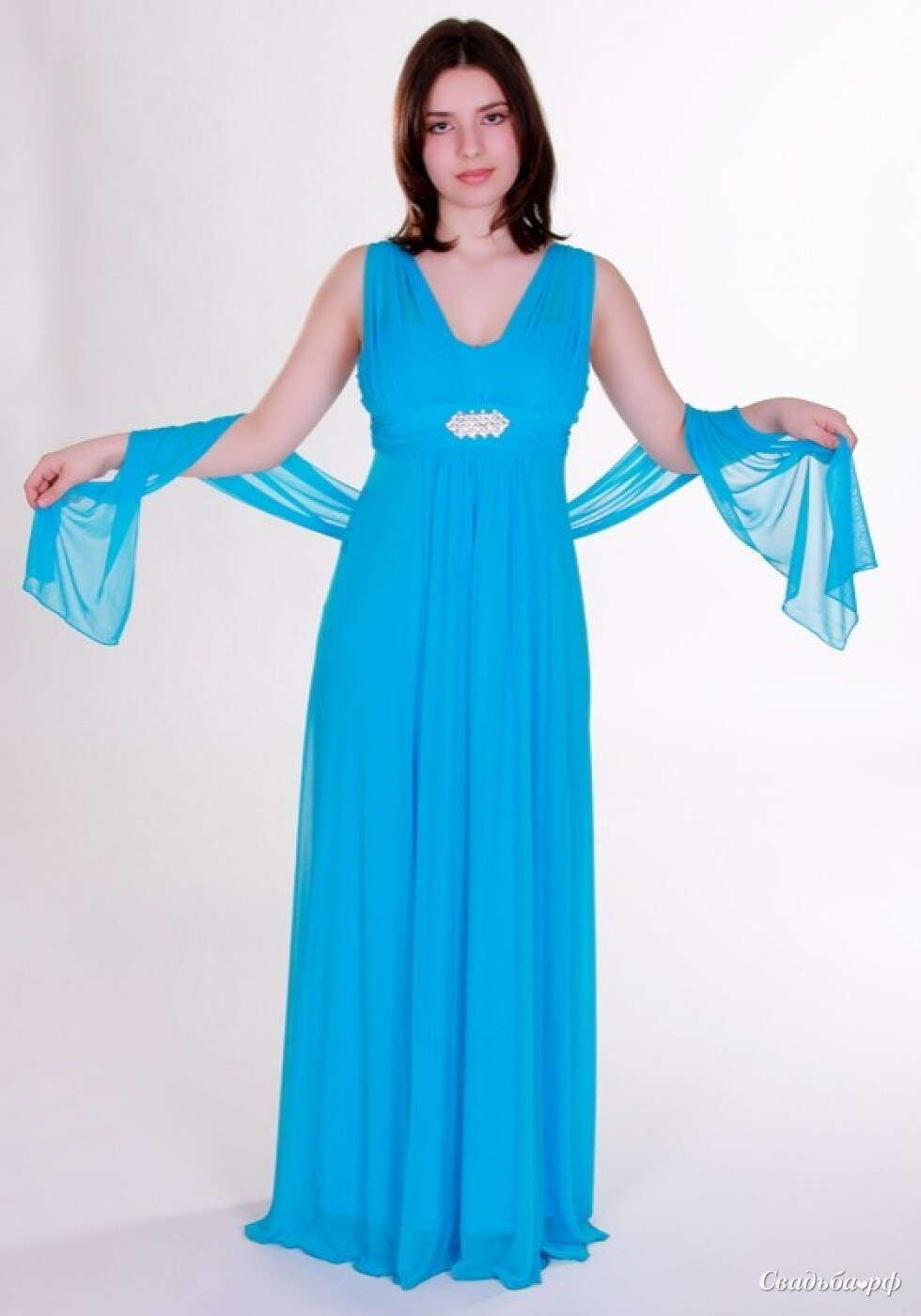Платье выполнено в греческом стиле с широкими лямочками и классической брошью под лифом. Широкий палантин дополняет яркий образ «Богини».