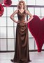 Невероятно красивой и изысканной будет выглядеть каждая девушка в этом изумительном вечернем платье насыщенного шоколадного цвета. Глубокий V-образный вырез модели сформирован драпировкой, плавно переходящей в бретели. Вдоль по корсету и расширенной книзу длинной юбке также спускаются волны изящной драпировки.