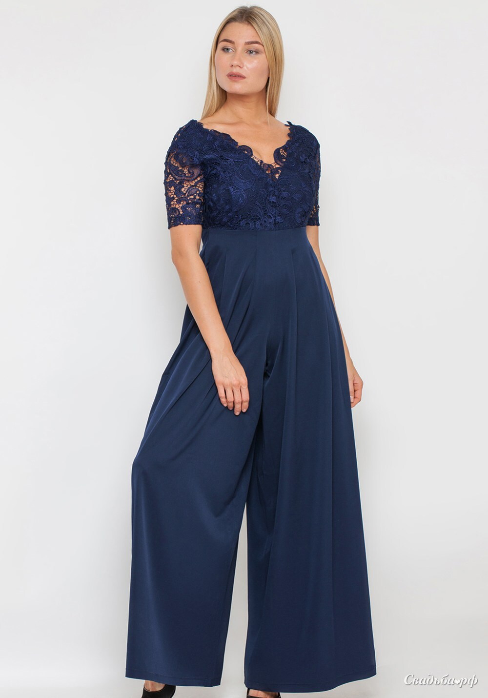 Оригинальный наряд для особого мероприятия. Цельнокроеный комбинезон 'клеш от бедра'. Благодаря завышенной талии с неглубокими складками создается полное ощущение, что вы надели изысканное платье. Приятный к телу материал подчеркивает силуэтные линии. Верх комбинезона исполнен из высококачественного кружева с необычным узором. V-образный вырез горловины и полуоткрытая спина визуально вытягивают общий силуэт и создают плавность линий.