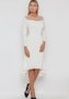 Благодаря легкой ткани с эластаном платье гармонично садится на любую фигуру. Модный фасон "рыбка" с удлиненной задней частью юбки. Приталенный силуэт подчеркивает женственный образ. Верхняя часть лифа выполнена из прозрачной сетки, декорированной жемчужными бусинами. Округлый вырез горловины, длинные рукава. Платье на подкладке.