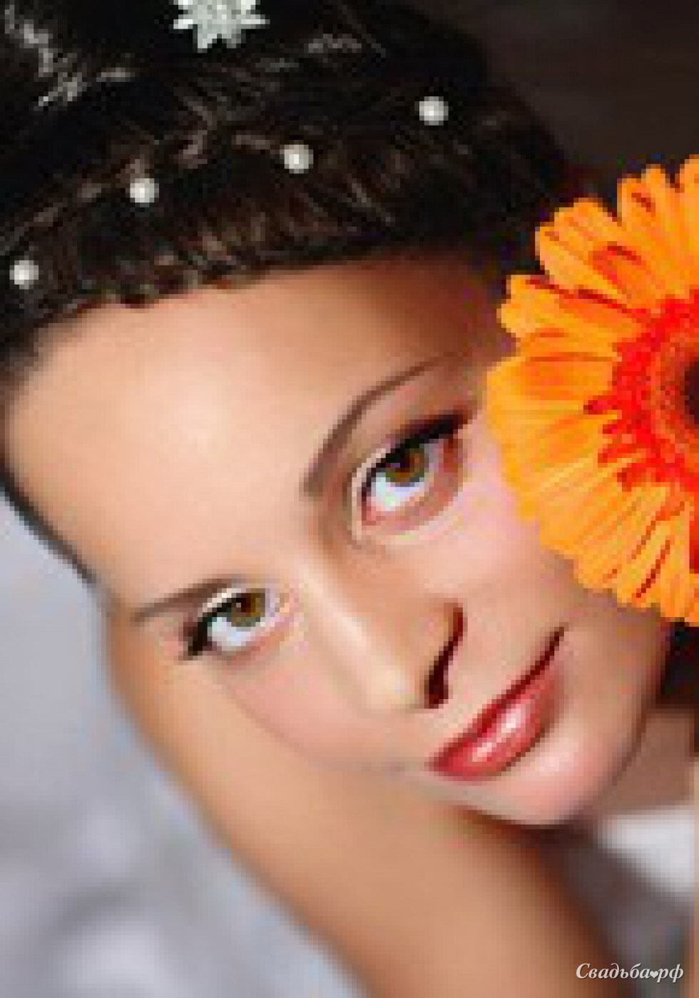 Макияж подчеркивает красоту карих глаз. Стрелки на верхнем веке. Красиво прорисованные брови. Внешний уголок глаза выделен темно- коричневыми тенями.