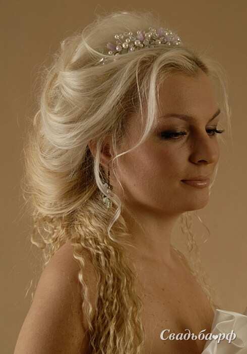 Свадебная причёска со сверкающей диадемой выполнена в греческом стиле. Пряди подняты вверх и слегка зафиксированы на затылке. Несколько локонов обрамляют лицо. Изящные кудри падают на плечи и спину. Такая необычная модель эффектно смотрится на длинных и средних волосах. Укладка подходит практически любому типу лица.