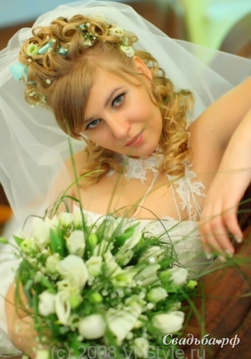 Чудесный вариант для невесты со средней длиной волос. Эта прическа позволит часть волос собрать на макушке в виде красивого плетения, которое станет хорошей основой для закрепления фаты. А другую часть волос оставить в виде красивых кудрявых локонов, ниспадающих до плеч. Прическа украшена живыми цветами и стразами.