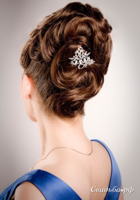 Свадебная причёска с собранными волосами придётся по вкусу самым элегантным модницам. Длинные волосы зачёсаны назад и зафиксированы в объёмную шишку на затылке. Искусное переплетение локонов украшено сверкающими заколками. Такой эффектный образ можно дополнить облегающим платьем с открытой зоной декольте.