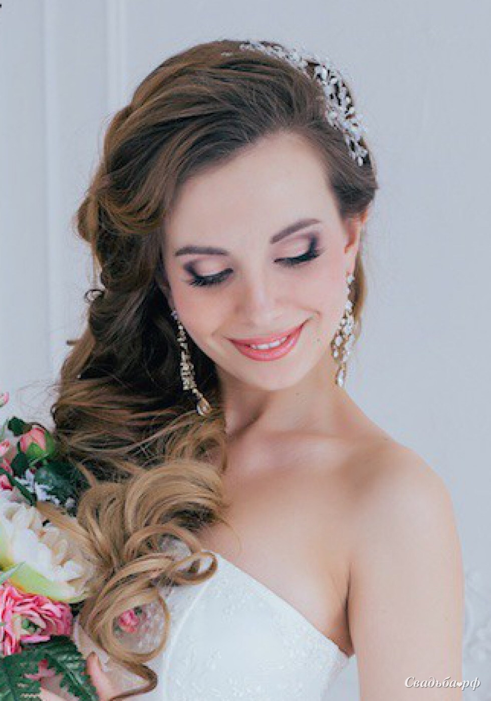 Данную прическу можно выполнить на любой длинне волос, если не хватает длинны или густоты, то возможно получить такой же результат, добавив накладные пряди из натуральных волос! Прическа будет держаться более суток! Данная прическа украшена "Веткой" из страз, что делает ее более нежной и романтичной - как у принцессы из сказки. Данная прическа подойдет почти к любому фасону платья. Так как у невесты открытое декольте, то было бы логичнее украсить эту зону колье, но мы решили его заменить на длинные серьги! Передняя часть волос невесты уложена с учетом особенностей формы лица и длинны волос этой зоны. К дааной прическе можно крепить фату на наивысшую точку головы - ничего проминаться не будет, т к в прическе применен плотный маленький валик, то сохраняет жесткость в месте прикрепления фаты. Макияж средней яркости, светлое веко и мягкая растушевка темного оттенка в уголках век. Гамма макияжа подбирается не под цвет платья или букета!!! - подбирается под цветотип человека: цвет глаз, кожи, волос. Другие работы вы можете увидеть на моем сайте www.vizaj.ru